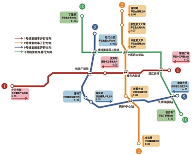 沈阳地铁一、二、九、十号线 14座首班车始发车站及发车时间示意图 扫码了解沈阳地铁十号线 市民试乘地铁十号线。 ?地铁十号线一期工程开通纪念卡 ?地铁十号线一期工程开通纪念邮册 ?沈阳地铁吉祥物“阳阳” 2013~2020 十号线建设大事记 ●2013年3月22日工程开工建设 ●2018年9月16日实现正线短轨通 ●2018年10月10日实现全线长轨通 ●2019年4月8日洞通 ●2019年4月16日电通 ●2019年6月5日轨通 ●2019年12月31日试运行 ●2020年4月29日开通运营 关于十号线您想知道的在这里 今日 9时18分 十号线一期工程 开通运营 2020年4月29日,沈阳地铁十号线一期工程正式开通运营,这标志着沈阳地铁正式进入“十+环”线网时代。地铁十号线和九号线实现“双剑合璧”,一环的东南西北,乘坐地铁就可以说走就走。据了解,4月29日上午9时18分,十号线所有车站正式开门纳客。 共设多少座车站? 沈阳地铁十号线共设21座车站,分别为丁香湖站、元江街站、向工街站、塔湾街站、淮河街沈医二院站、百鸟公园站、长江街站、中医药大学站、陵东街站、北塔站、合作街站、东北大马路站、滂江街站、长安路站、万莲站、泉园站、江东街站、长青桥站、长青南街站、理工大学站、张沙布站,总长度27.18公里。 首班车几点发车、车隔多久? 沈阳地铁十号线两端起止车站丁香湖站和张沙布站首班车发车时间均为早5:30(开通当日除外),工作日早晚高峰行车间隔为6分7秒,双休日高峰行车间隔为7分20秒。 票价最高多少? 十号线的票价最高为6元,地铁全线最高票价为7元,从4月29日正式开始售票。 沈阳地铁全线网如何换乘? 十号线开通运营后,沈阳地铁全线网共计有7座换乘站。其中,青年大街站为一、二号线换乘站,铁西广场站为一、九号线换乘站,奥体中心站为二、九号线换乘站,滂江街站为一、十号线换乘站,中医药大学站为二、十号线换乘站,淮河街沈医二院站和长青南街站为九、十号线换乘站。 一、二、九号线部分车站 首班车发车时间有所调整 为方便乘客出行,结合十号线开通,沈阳地铁充分研究线网客流分布,分析乘客出行规律,对线网首班车多点发车进行优化,将二号线五里河站开往全运路方向首班车,调整至市图书馆站,其他多点首班车发车车站不变。十号线开通后,一、二、九号线部分车站首班车发车时间有所调整,线路两端车站末班车发车时间与一、二、九号线保持一致,目前为23:00。 体验 “苹果绿”为城市带来更多活力 4月28日上午,记者在十号线开通之前来到长安路站和滂江街站探访。长安路站站内已经全部准备就绪,在地铁B口,立着长安路站首末班车时间表,上面同时也将地铁一号、二号、九号和十号线的首末车时间印上,让人一目了然。安检处已经摆放好了测温仪和消毒湿巾,防疫措施准备得相当充分,每一个进入地铁的人都需要登记和测温。地铁十号线整体是以漂亮的苹果绿为基调。车体、自动购票机,甚至刷卡区的二维码扫描口都是绿色的,有很强的辨识度。 滂江街站主题车站满载市民祝福 目前,十号线列车正处于空车运行状态,记者搭乘列车从长安路站到滂江街站。滂江街站是十号线的特色主题车站,也是与一号线的换乘站,站内设有换乘通道的主题墙、G出入口的主题通道、墙贴画及主视觉图片。 设在换乘通道的主题墙展示有征集到的市民对十号线的祝福。同时参与了地铁九号线和十号线建设的王才的照片出现在主题墙上。王才说:“虽然我从事的是一线最辛苦的工作,但我仍旧拿出十足劲头,在工作中也努力学习操作技术和新技能,我们农民工兄弟也要与时俱进,不断学习。前年我也买了地铁附近的房子,十号线通车,我也能坐着地铁去工地了。” 记者看到,在主题墙海报中,十号线列车也以拟人化的方式在市民进入到十号线的第一时间向乘客致以问候。主题墙海报整体色调采用了十号线线路色苹果绿,同时也寓意着十号线的开通将带给城市更多活力。 G出入口主题通道通过对文创产品设计元素的二次创意,既展示了十号线沿线的风景,也以“铁丝儿·爱”系列为主题串联起十号线开通后乘坐地铁可以到达的城市地标和畅游城市的不同点位,寓意“十+环”时代开启后,沈阳地铁出行的范围将进一步扩容。 墙贴画通过手绘画的方式展示了故宫、昭陵、中山广场、彩电塔、“大钻石”等沈阳地标性建筑物剪影,将城市文化植入到地铁乘客出行的过程中。 主视觉图片以邮资封和邮票图案为设计元素进行二次设计,突出了“10”元素,紧扣十号线开通的主题。 东北首个地铁科普馆今起免费开放 随着沈阳地铁十号线一期工程开通运营,东北地区首个地铁站内科普馆——“沈阳地铁科普馆”也将在滂江街站十号线站厅及一、十号线换乘通道内与乘客正式见面。沈阳地铁集团有限公司党委办公室副主任姜明凯告诉记者,科普馆设工程建设和地铁运营两个展厅,由28块手绘科普灯箱、25组墙贴展示和10个展柜陈列组成。十号线开通运营后,沈阳地铁科普馆将长期免费向公众开放。 工程建设厅位于一、十号线换乘通道内,12幅手绘漫画介绍了地铁线网规划、勘察方法、前期工作、土建工程施工工法、设备系统施工、车站结构及地铁车辆段等相关知识;10个展柜内陈列了地铁一、二、九、十号线列车和盾构机模型,同时陈列盛京通卡等文创类产品和沈阳地铁运营十年来的技改成